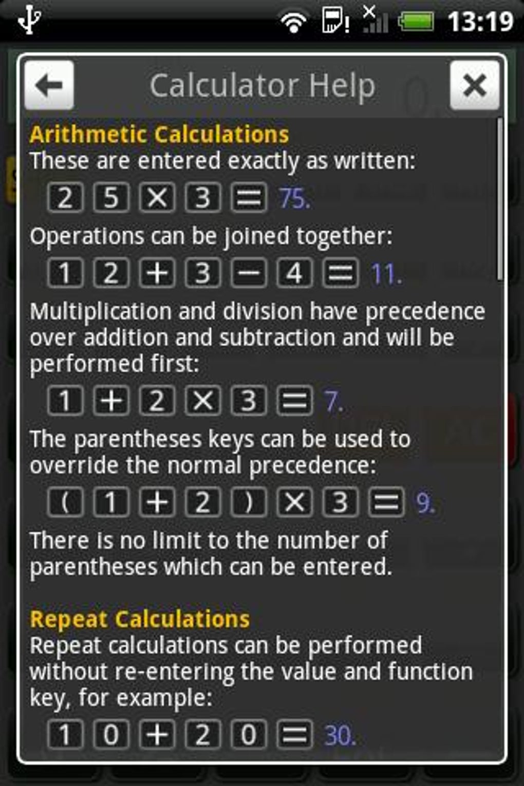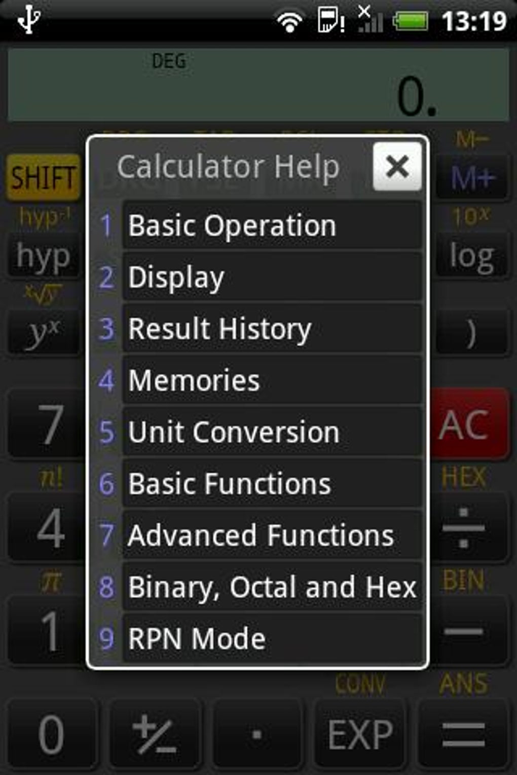 RealCalc Scientific Calculator を起動すると画面一杯に、オーソドックスなタイプの関数電卓が表示されます。操作感は実際の関数電卓とほぼ同様です。搭載されている機能はとして対数、統計計算、三角関数、物理定数表などがあり、各分野の専門的な計算にも充分に対応できる使用になっています。単位の変換機能にも対応しており、手軽に分からない単位を変換する事ができます。